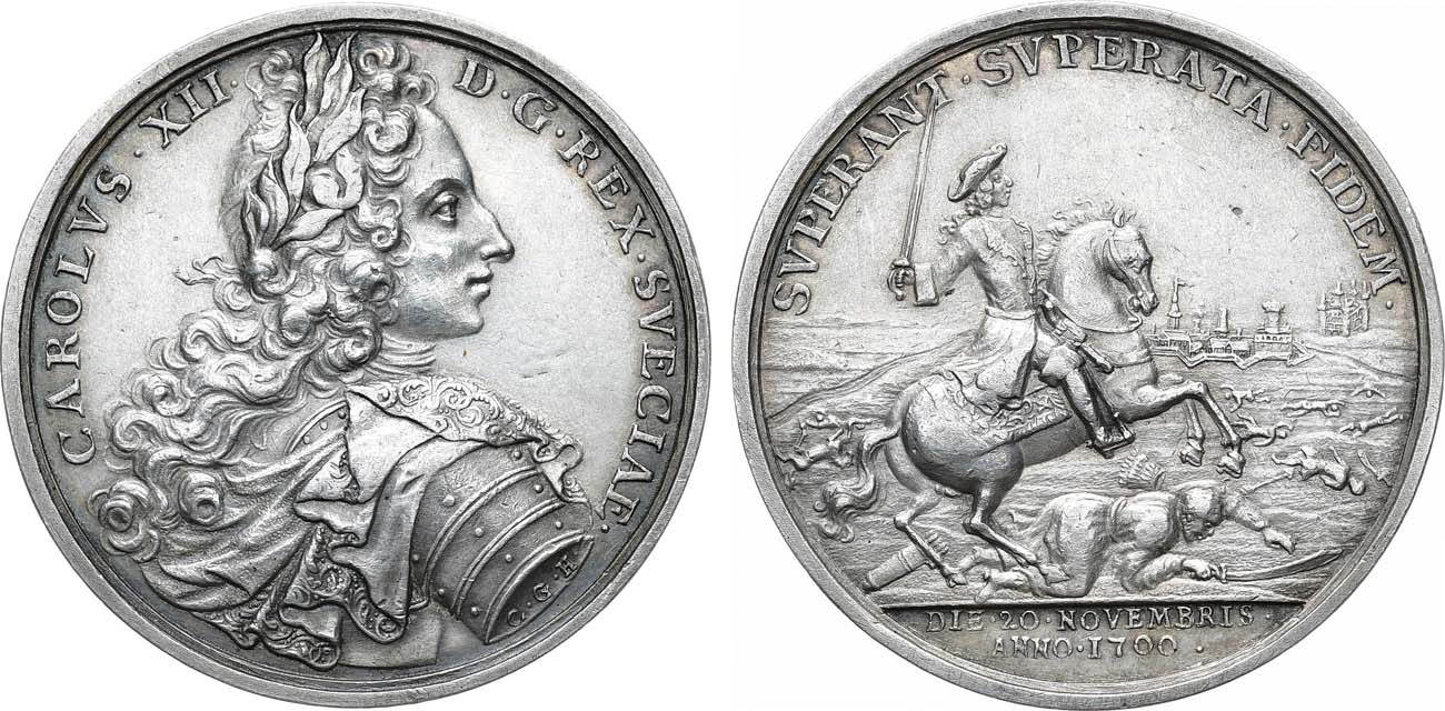 Серебро. 29,3г. Диаметр: 37 мм. Медальер Карл Густав Хартманн (аверс: "C•G•H•" в обрезе рукава). Аверс: портрет короля Карла XII в латах вправо. Реверс: изображение Карла XII на коне с саблей, в образе победителя, на фоне реки Наровы, города Нарвы и русской пограничной Ивангородской крепости. Hildebrand 40. AU.