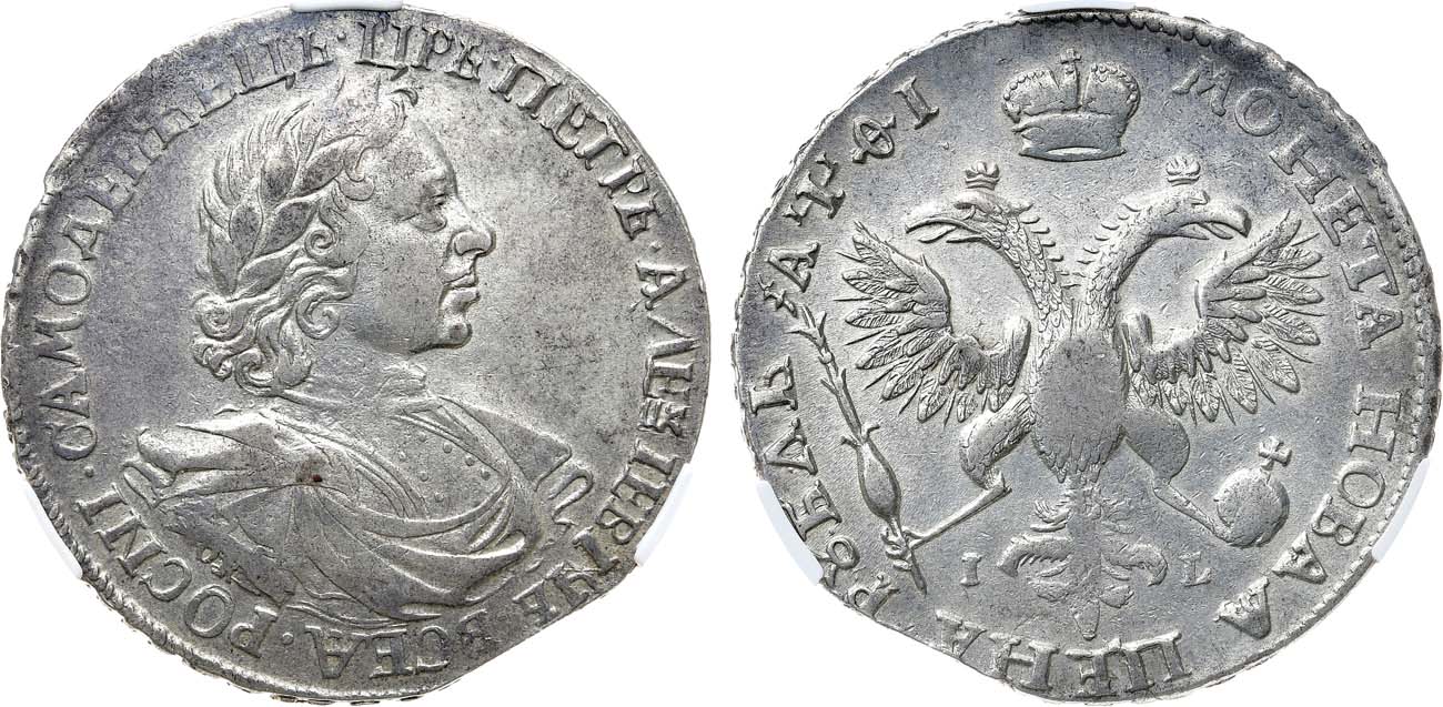 Довольно редкая разновидность рубля 1719 года с инициалами "ILL" на реверсе.
