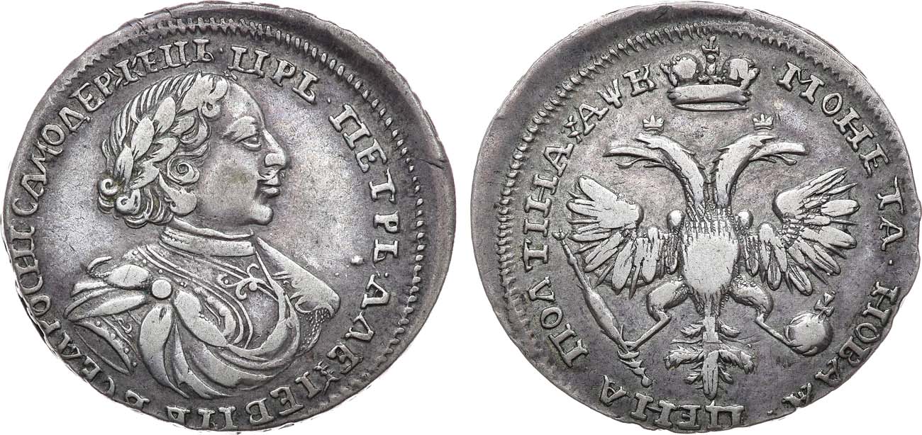 Серебро. 14,16г. Кадашевский монетный двор. Тип 1718-1720 гг. Портрет в латах и мантии. Аверс: без инициалов медальера, с пряжкой на плаще, плащ без меха, с арабесками на груди. Уздеников 0594. Биткин 656 (R2). 3 рубля по Петрову. Дьяков 219, 1054 (R2). XF 40.