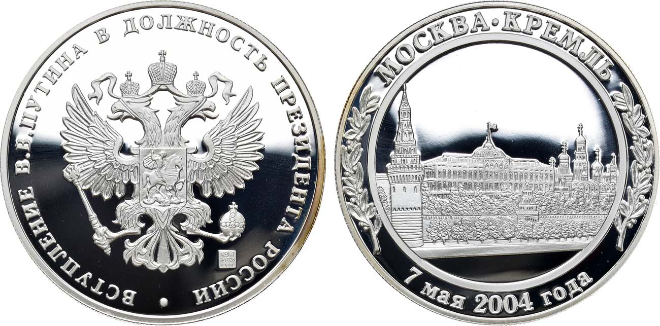 Самая первая из серии медалей на вступление в должность Президента России. Медаль вложена в капсулу.