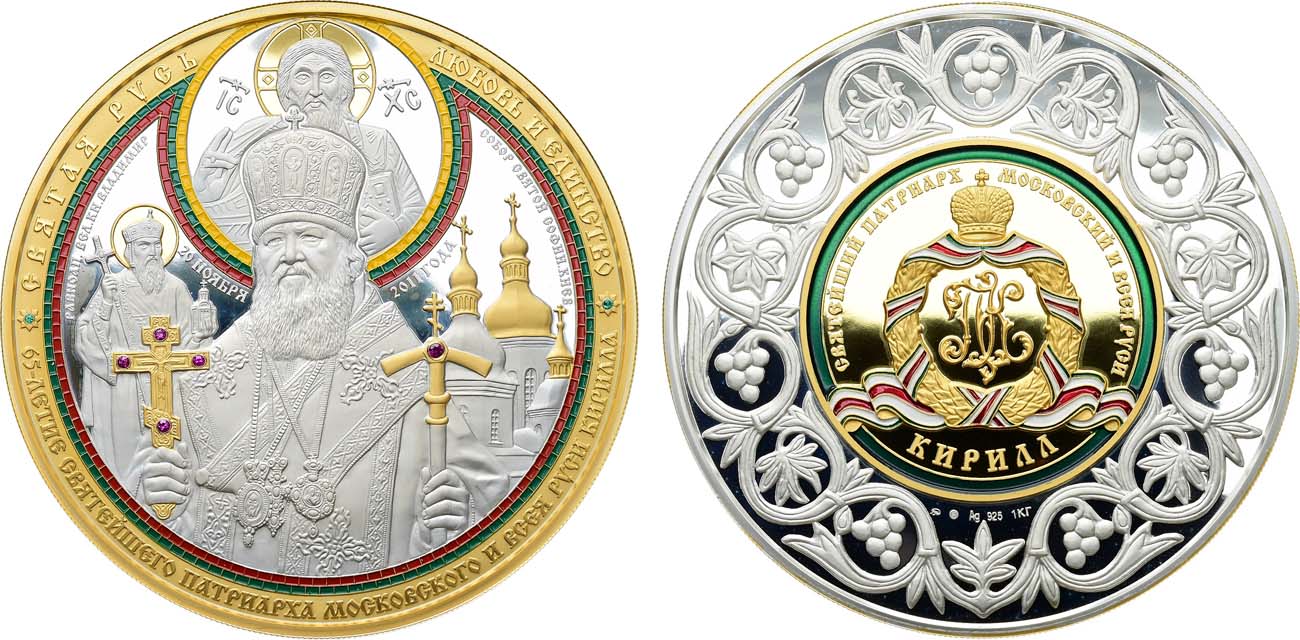 Серебро, позолота, эмаль, стразы. 1084,53г. Диаметр 100 мм. Московский монетный двор. Реверс: вдоль вставки 4 клейма: ММД, Женская голова в кокошнике вправо, Ag 925, 1 КГ. Тираж: 33 экз. PROOF.