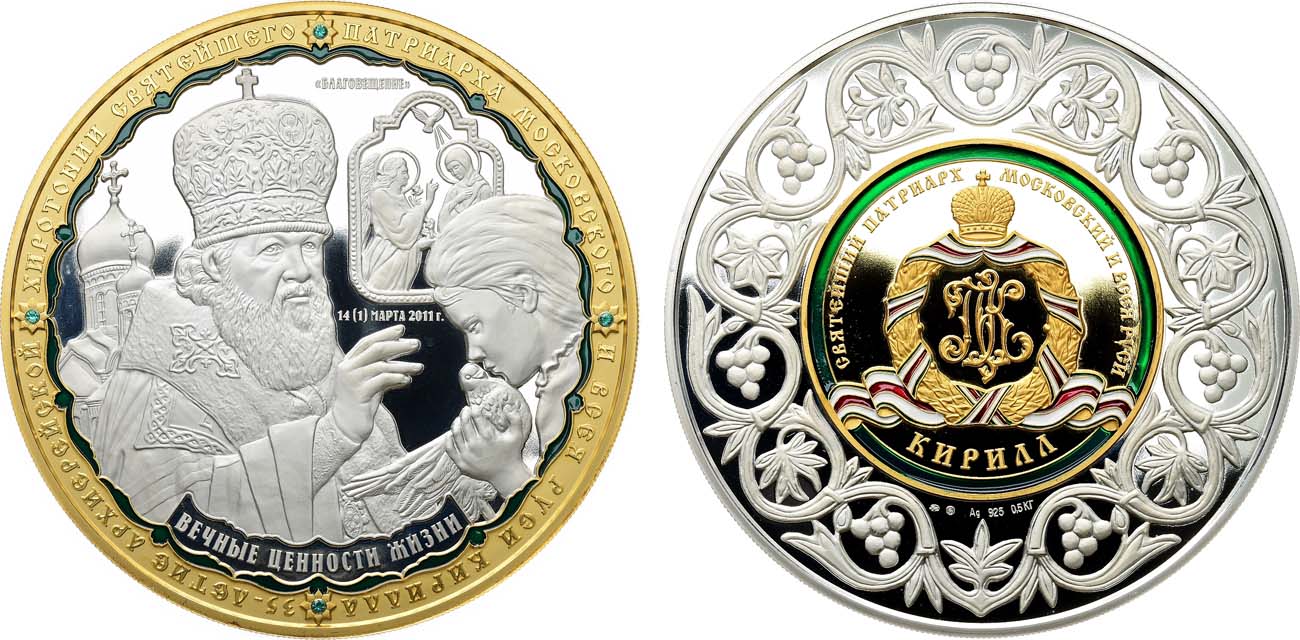 Серебро, позолота, эмаль, стразы. 540,54г. Диаметр 100 мм. Московский монетный двор. Реверс: вдоль вставки 4 клейма: ММД, Женская голова в кокошнике вправо, Ag 925, 0,5 КГ. Тираж: 33 экз. PROOF.