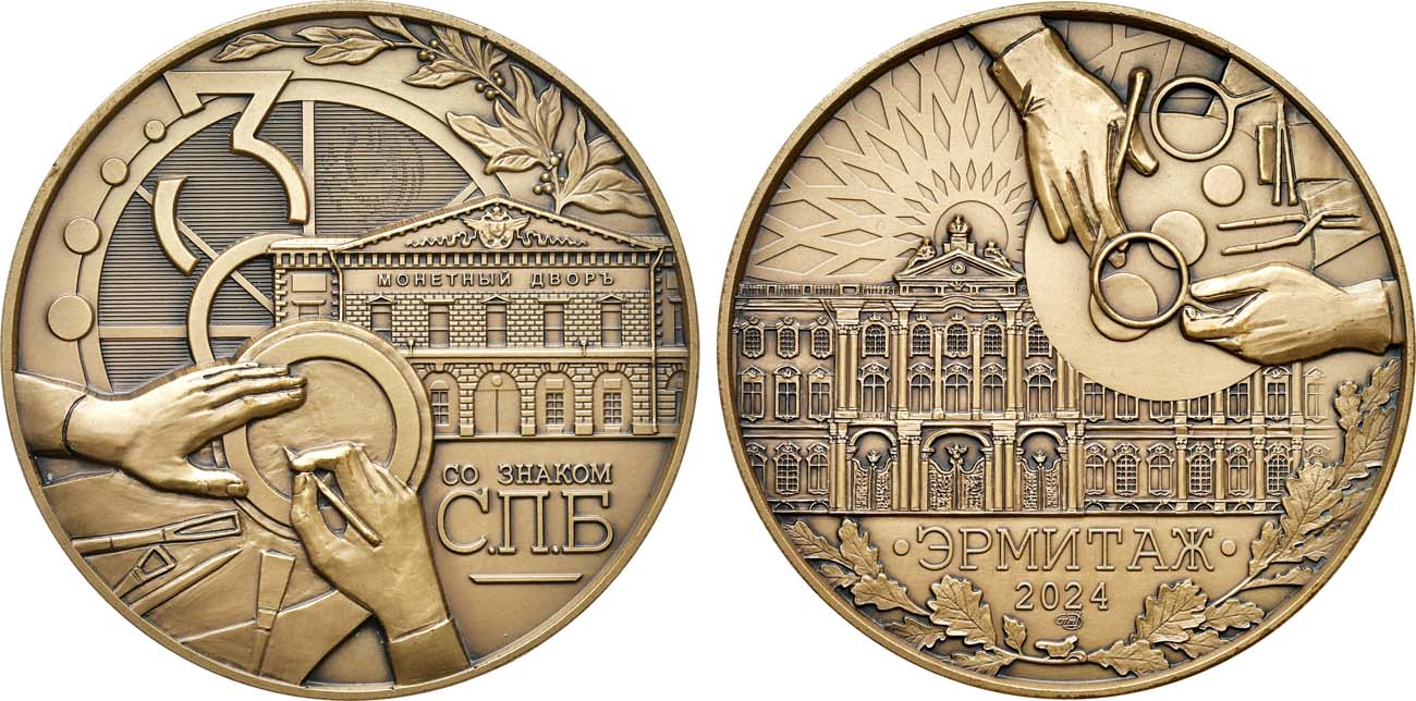 Специально к открытию выставки «Со знаком “С.П.Б.”», посвященная 300-летию Санкт-Петербургского монетного двора, на Санкт-Петербургском монетном дворе отчеканили памятные медали и жетоны с изображением здания Санкт-Петербургского монетного двора и Зимнего дворца. Они выполнены по эскизу художницы Пермской печатной фабрики – филиала АО «Гознак» Алины Хохряковой, доработанному художником дизайнерского центра АО «Гознак» Андреем Брынзой.