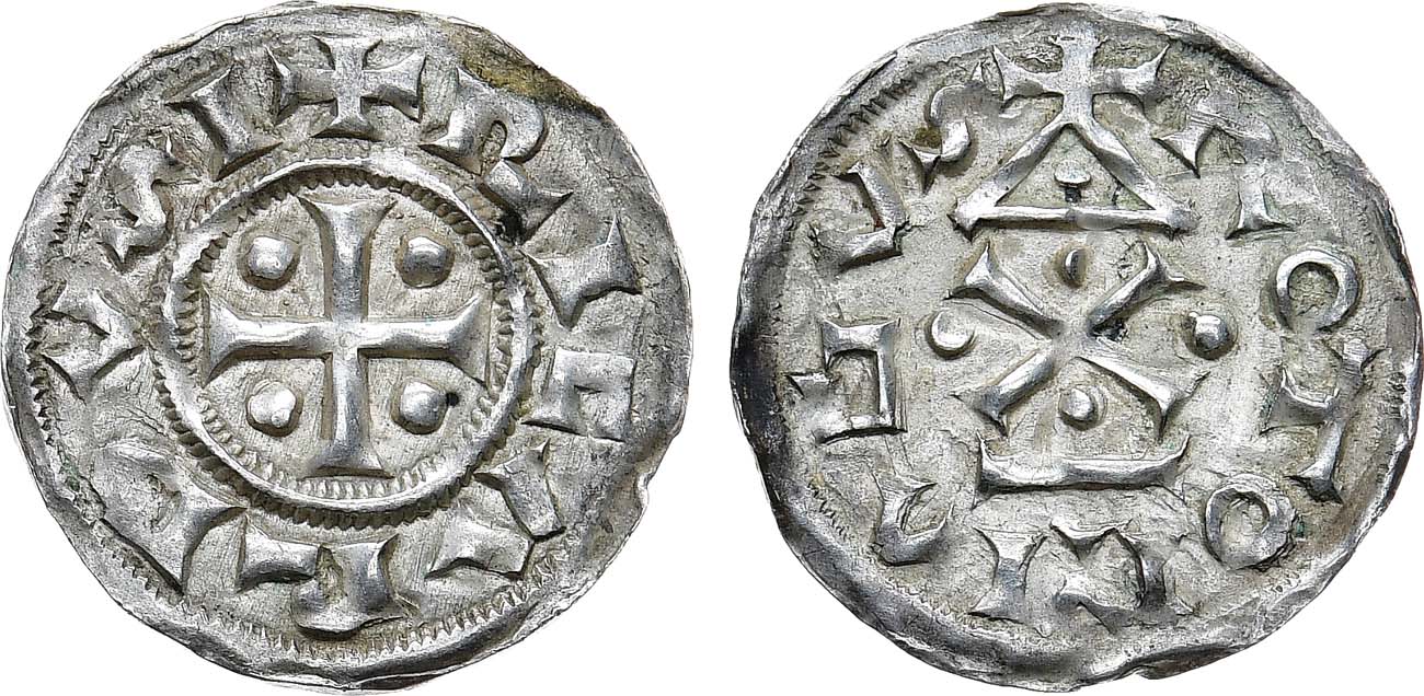 Серебро. 1,17г. Руан. Аверс: храм и легенда "+ROTOMAVS". Реверс: "+RICARDUS I". Fecamp 773. Feodales 16. Legros 192. UNC.
