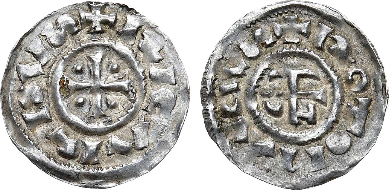 Серебро. 1,25г. Руан. Аверс: круговая легенда "+ROTOMAVS". Реверс: круговая легенда "+RICARDUS I". AU.