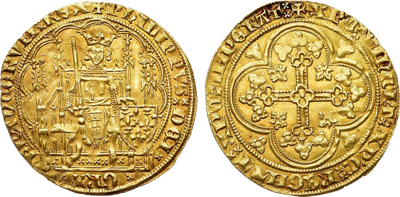 Золото. 4,42г. Первый выпуск (с троном). Аверс: круговая легенда " + PHILLIPPVS ⁑ DЄI / ˣ GRA ˣ / FRANCORVM ⁑ RЄX"; изображение короля с мечом на троне. Реверс: круговая легенда "+ XP'C ⁑ VINCIT ⁑ XP'C ⁑ RЄGИAT ⁑ XP'C ⁑ IИPЄRAT"; изображение украшенного креста. Duplessy 249. Fried 270. Ciani 282. AU/UNC.