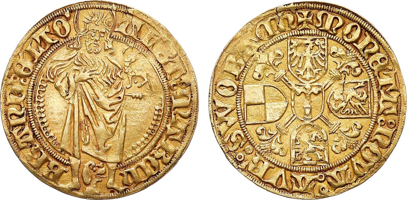 Золото. 3,22г. Швабах. Аверс: круговая легенда "ALBT′:MARCh′ – BRAND:ЄLTO′"; изображение Иоанна Крестителя анфас с Агнцем в левой руке. Реверс: круговая легенда "✠MONЄTA:NOVA:AVR′:SWOBACh′"; украшенный лилиями крест с 4 гербами по сторонам и одним в центре. Schrötter 340. Friedberg 304. Wilmersdörffer 414. AU.