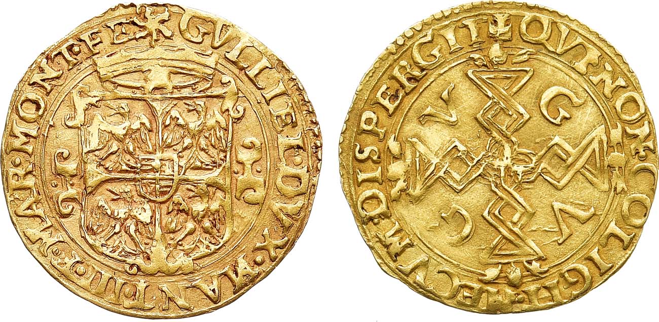 Золото. 3,26г. Аверс: круговая легенда "GVLLIEL DVX MANT III E MAR MONT FE"; изображение герба. Реверс: круговая легенда "QVI NON COLIGIT MECVM DISPERGIT"; изображение орнаментированного креста. MIR 266 (R). Fr. 178. CNI 29/32. AU/UNC.