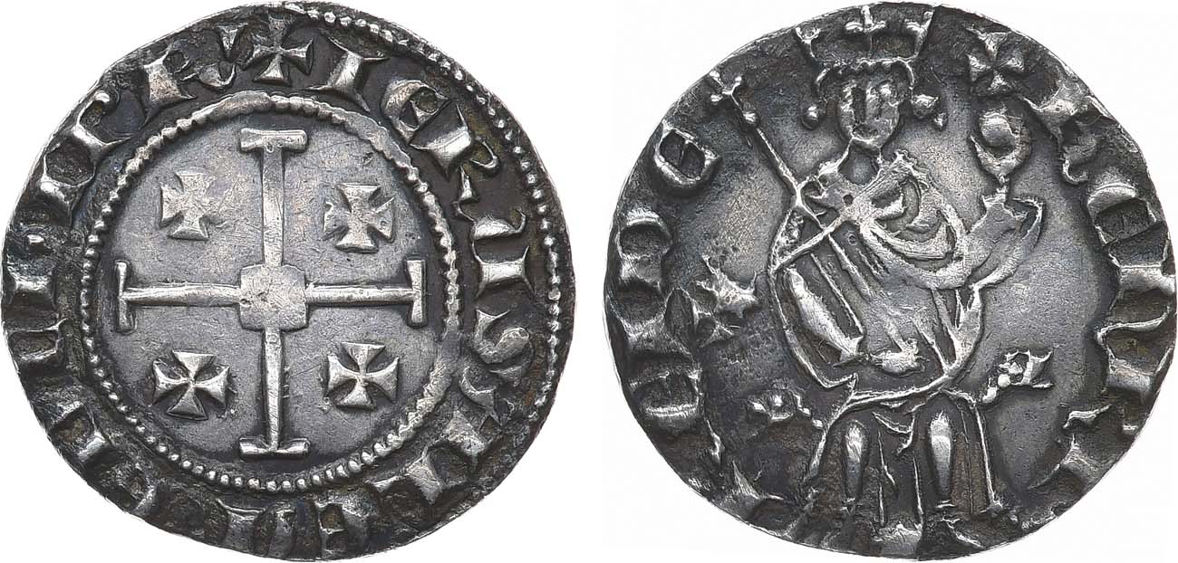 Серебро. 4,4г. Никосия. Аверс: круговая легенда "+ hЄnRI RЄI DЄ "; тронное изображение короля Генриха со скипетром и державой. Реверс: круговая легенда "+ IЄRVSALЄM Є D' ChIPR"; изображение иерусалимского креста. AU.