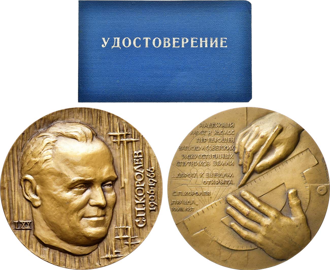Томпак. 125,96г. Диаметр 65 мм. Ленинградский монетный двор. Медальер А.Г. Шагин (на реверсе на 3 часа "Шагин 1976 ЛМД"). Тираж 2270 экз. Шкурко, Салыков 1012. UNC. Удостоверение: Награждается Ганин Николай Николаевич, принимавший непосредственное участие в освоении космических программ в СССР и в честь 75-летия со дня рождения С.П. Королёва. Две рукописные подписи и печать "Федерация Космонавтики СССР".