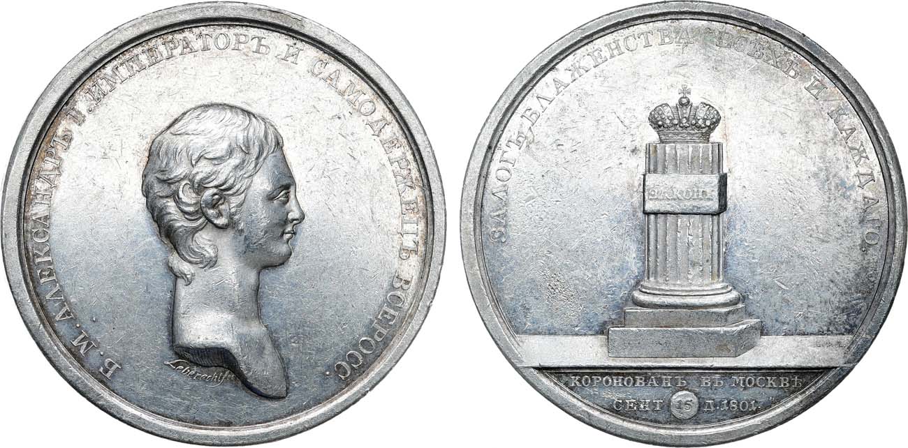 Серебро. 46,08г. Диаметр 51 мм. Санкт-Петербургский монетный двор. Аверс: медальер К. Леберехт (под портретом "Leberecht fec"). Реверс: медальер Ф.А. Лялин (справа над обрезом: "К.Ф.Л."), копия штемпеля К.И. Мейснера. Дьяков : аверс - 264.3(R3), реверс не описан. AU/UNC.