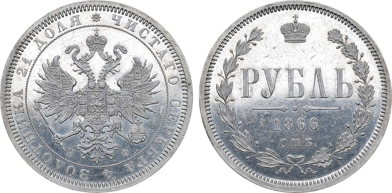 Рубли 1866 года с инициалами минцмейстера "НФ" встречаются реже, чем с инициалами "НI".