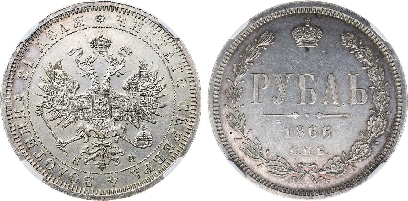 Рубли 1866 года с инициалами минцмейстера "НФ" встречаются реже, чем с инициалами "НI". С аукциона Dr. Busso #397, Франкфурт-на-Майне, ноябрь 2008 года, лот 1582.