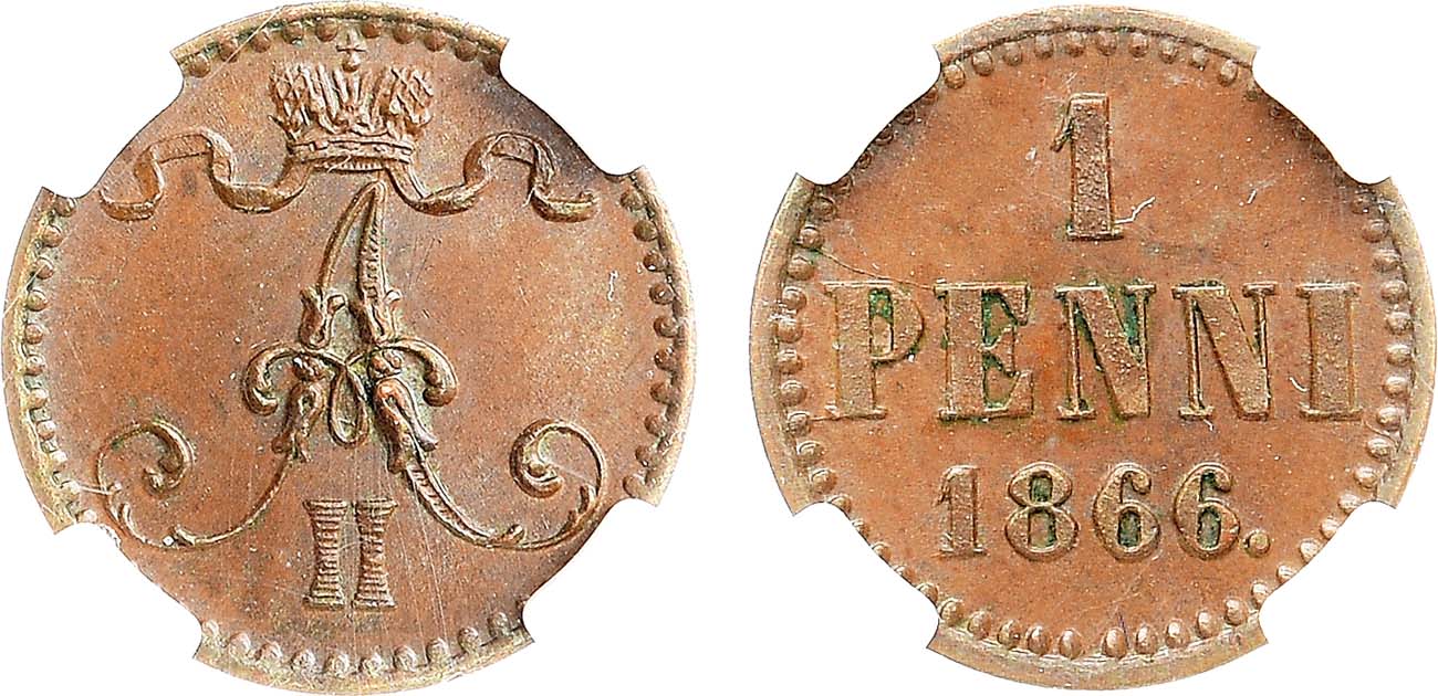 Медь. Для Финляндии. Гельсингфорсский монетный двор. Уздеников 4673. Биткин 666. MS 60 BN.