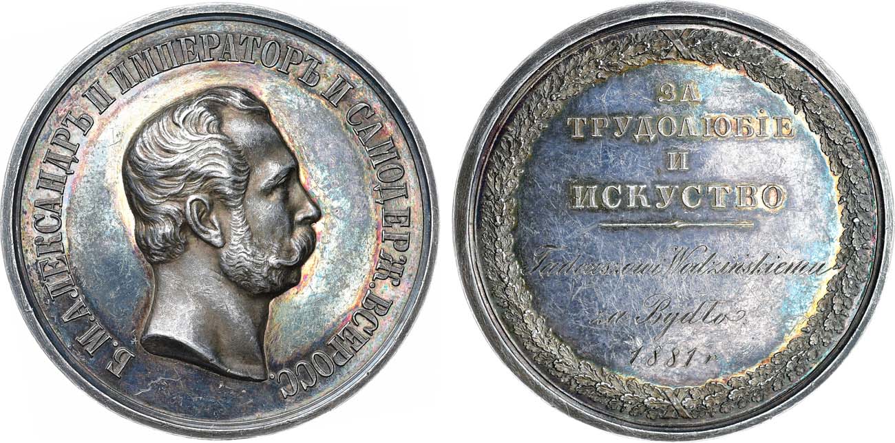 Серебро. 32,65г. Диаметр 41 мм. Санкт-Петербургский монетный двор. Без подписи медальера. Реверс: гравировка на поле под надписью на польском на польском языке в три строки: "Tadeuszowi Wodzinskiemu / za Bydto / 1881 г". Смирнов 567/б3. Дьяков 642.7(R1). UNC.
