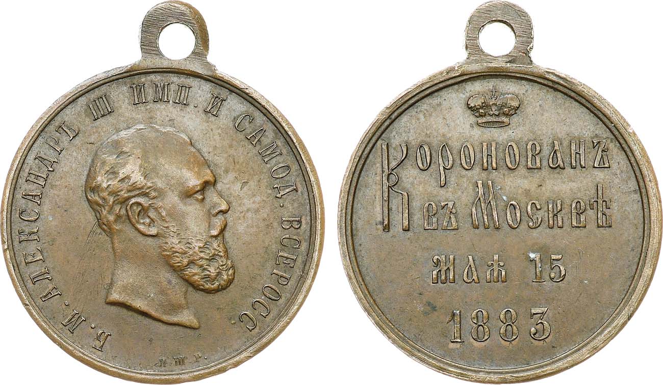 Темная бронза. 15,34г. Диаметр 29,5 мм. Санкт-Петербургский монетный двор, 1883-1884 гг. Медальеры: аверс — Л.Х. Штейнман (под бюстом, внизу: "Л.Ш.Р."), реверс — М.Я. Габе (без подписи). Биткин 1075. Смирнов 886. Дьяков 932.1 (R0). AU/UNC.