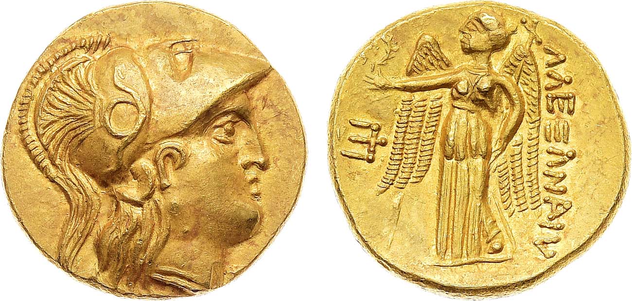 Золото. 8,22г. Аверс: изображение головы богини Афины в шлеме - вправо. Реверс: ростовое изображение богини Ники, обращённой влево. UNC.