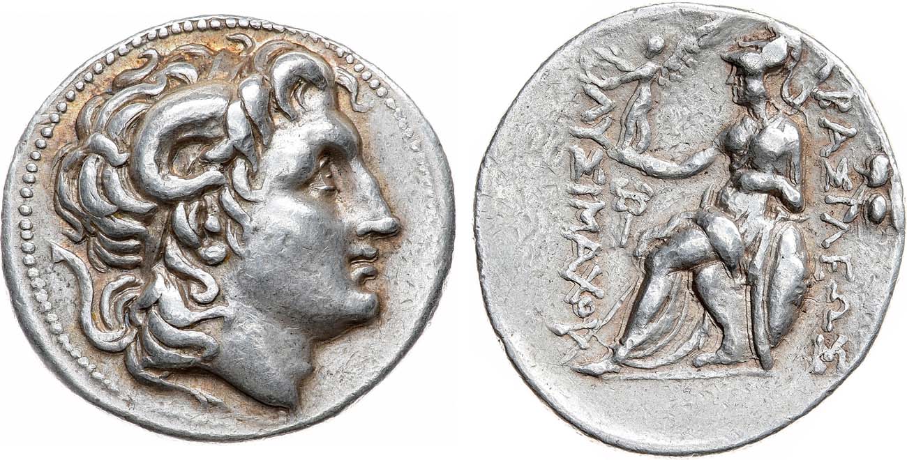 Серебро. 17,13г. Амфиполь. Аверс: портрет Александра вправо. Реверс: вертикальная легенда "ΒΑΣΙΛΕΩΣ - ΛΥΣΙΜΑΧΟΥ"; изображение сидящей на троне Афина - влево. XF.