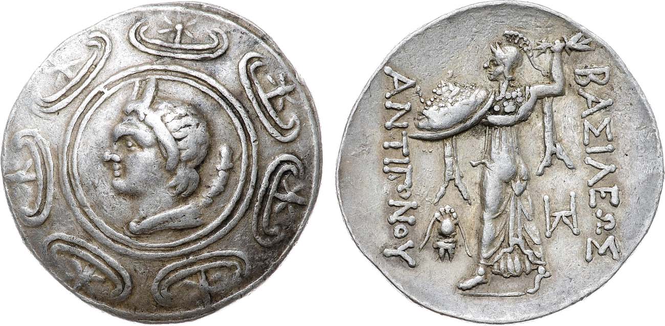 Серебро. 17,07г. Амфиполь. Аверс: изображение головы Пана - влево. Реверс: изображение Афины Промахос с пучком молний и щитом; легенда "BAΣILEΩΣ ANTIГONOY". Ashmolean 3259. Delepierre 1063. Copenhagen 1199. XF.