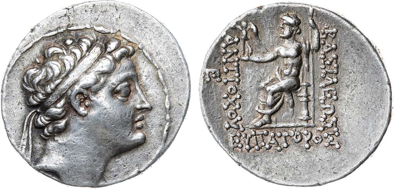 Серебро. 16,49г. Антиохия. Аверс: портрет царя в диадеме вправо. Реверс: вертикальная легенда "R/ ΒΑΣΙΛΕΩΣ/ ANTIOXOY/ EYΠΑΤΟΡΟΣ"; изображение Зевса со скипетром на троне - влево. SC 1575/4. CSE 139. Spaer 1247. XF.