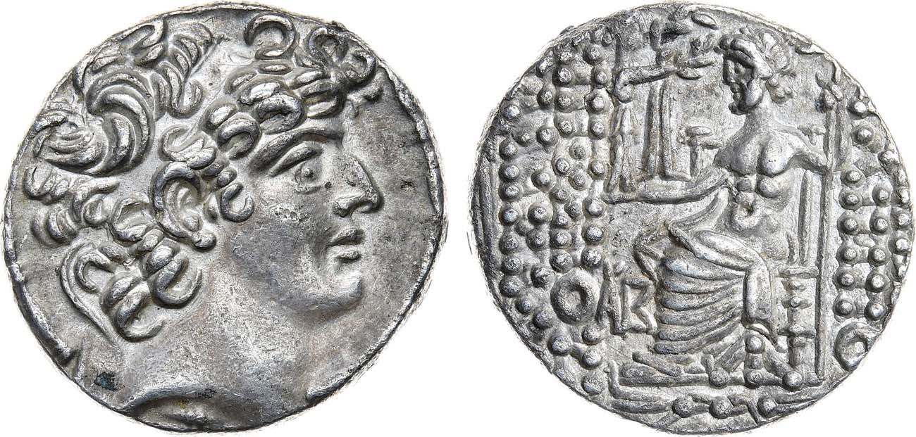 Серебро. 15,67г. Антиохия. Аверс: портрет царя в венке вправо. Реверс: изображение Зевса на троне влево, с копьём в левой руке и богиней Никой с лавровой ветвью в правой, в нижней части поля монограмма "АВ"; легенда "ΒΑΣΙΛΕΩΣ ΦΙΛΙΠΠΟΥ ΕΠIΦΑΝΟΥΣ ΦIΛΑΔΕΛΦΟΥ". SC 2489.1, RPC I 4124. AU.