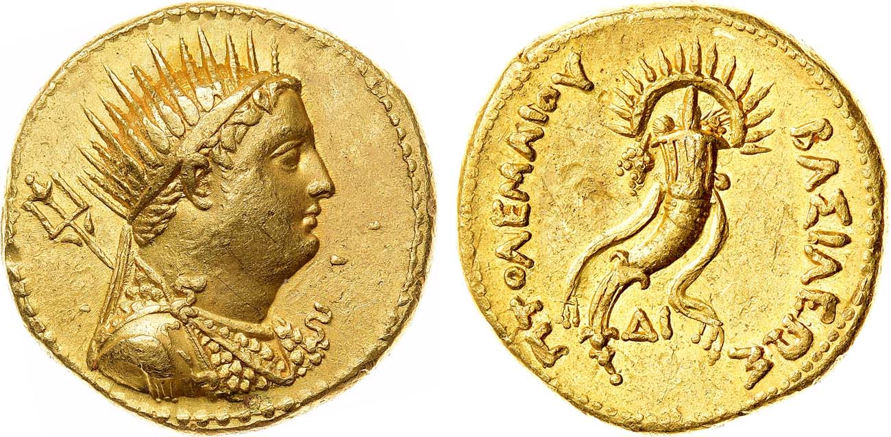 Золото. 27,86г. Александрия. Аверс: изображение обожествленного Птолемея III вправо. Реверс: изображение рога изобилия; круговая легенда "BAΣIΛEΩΣ – ΠTOΛEMAIOY". Svoronos 1117. Copenhagen 196. CPE 887. AU.
