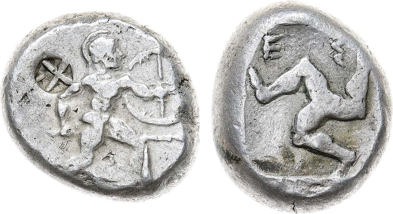 Серебро. 10,95г. Аспенд. Аверс: изображение воина с копьём и щитом, идущего вправо; круглое клеймо "-Х". Реверс: изображение триcкелиона. XF.