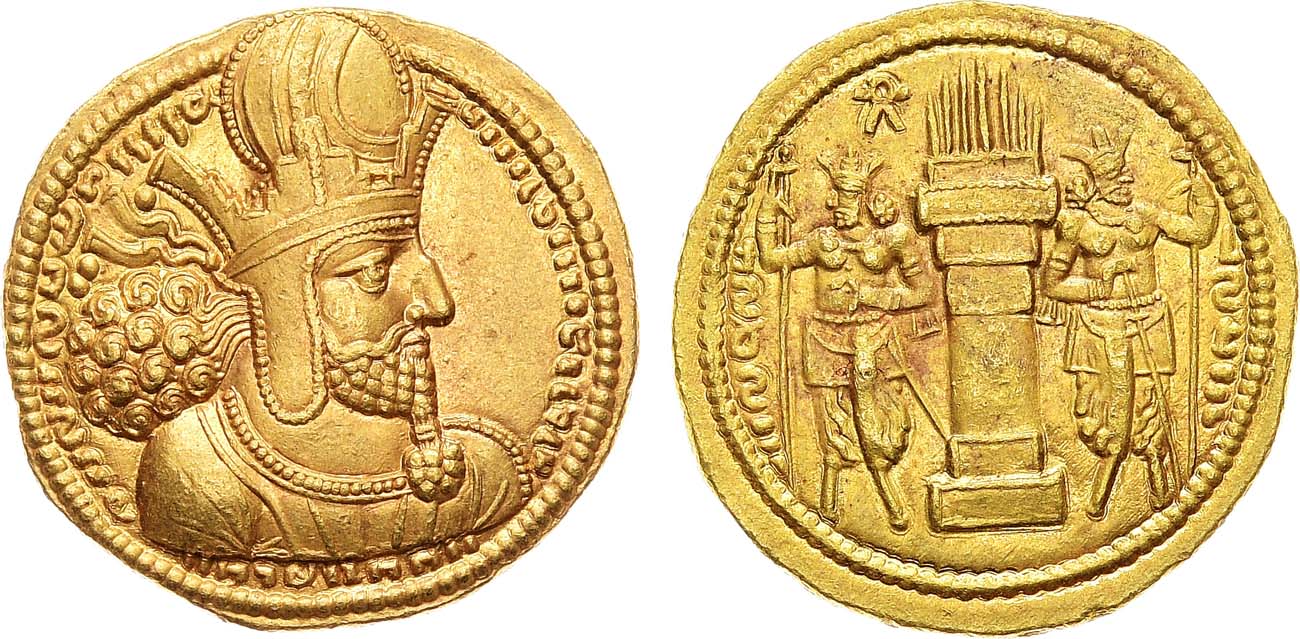 Золото. 7,35г. Ктесифон. Аверс: портрет Шапура I вправо. Реверс: изображение зороастрийского алтаря с двумя служителями по сторонам, слева от алтаря - знак монетного двора (телец). UNC.