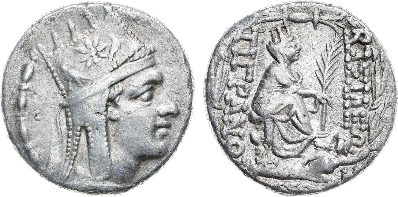 Серебро. 15,9г. Тигранокерт. Аверс: портрет Тиграна II в диадеме, украшенной звездой между двумя орлами. Реверс: легенда "BAΣIΛEΩ-Σ / TIΓPANOY"; изображение богини Тихе, сидящей на камне с лавровой ветвью в руке; внизу - изображение речного бога Оронта, плывущего вправо; внизу монограмма. AU.