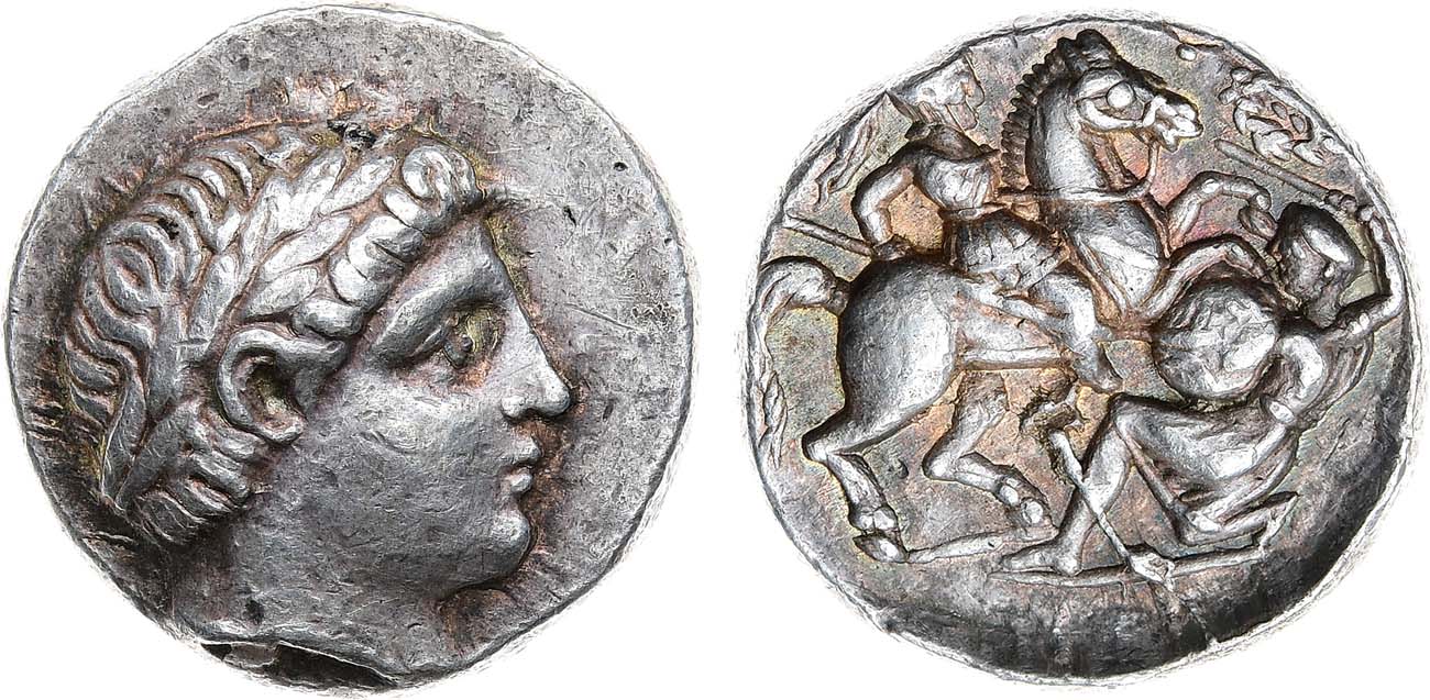 Серебро. 12,76г. Пеония (Северная Эллада). Аверс: изображение головы Апполона в лавровом венке вправо. Реверс: изображение всадника, поражающего копьём воина; легенда "ΠАТРАоҮ". AU.