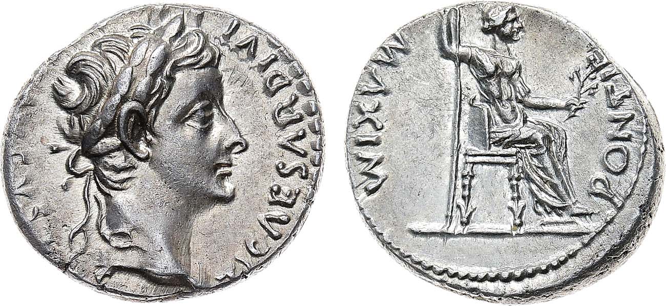 Серебро. 3,8г. Лугдун. Аверс: круговая легенда "TI CAESAR DIVI AVG F AVGVSTVS"; портрет императора вправо. Реверс: круговая легенда "PONTIF MAXIM", изображение сидящей Ливии вправо. Sear 1763. AU/UNC.