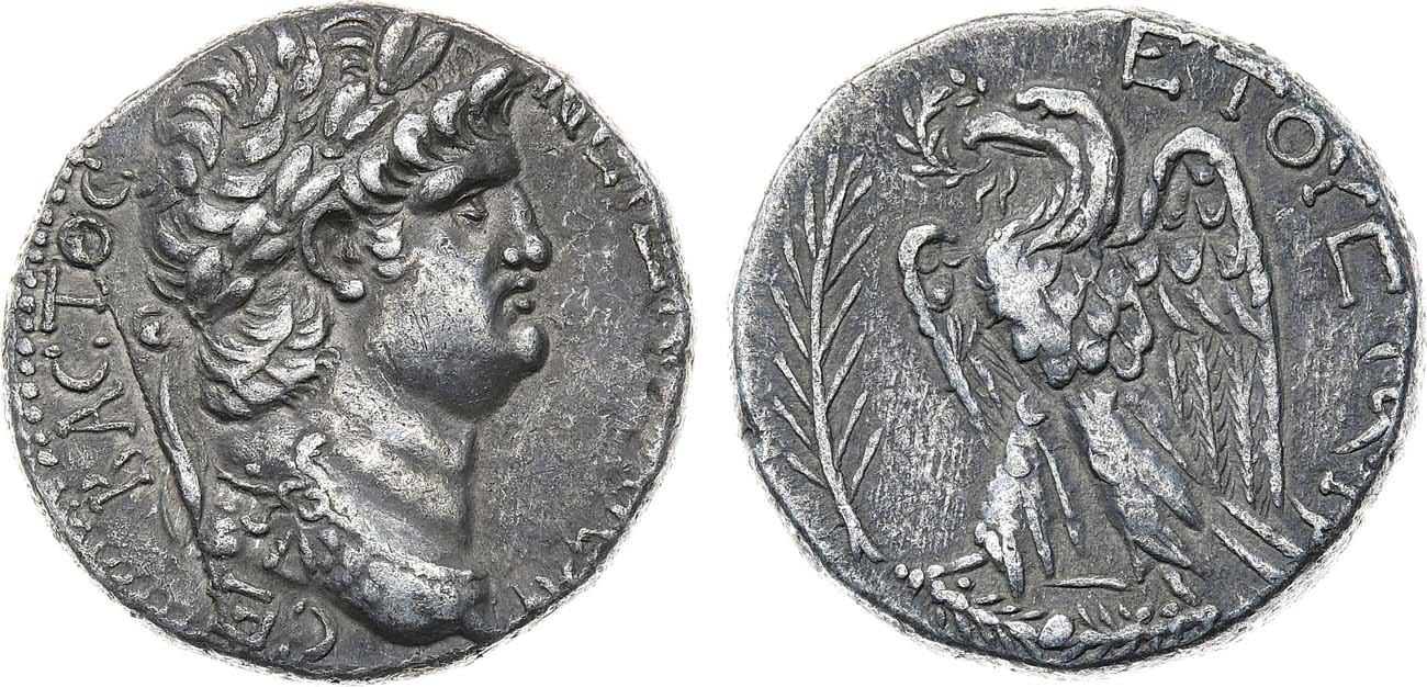 Серебро. 15,15г. Аверс: портрет Нерона вправо; круговая легенда "ΝΕΡΩΝ ΚΑΙΣΑΡ СΕΒΑСΤΟС". Реверс: круговая легенда "ΕΤΟΥϹ•ϚΙΡ"; изображение орла с распростёртыми крыльями - с венком в клюве - влево; слева пальмовая ветвь. RPC I 4192. AU.