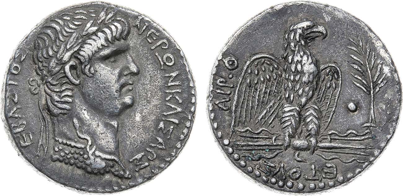Серебро. 14,85г. Аверс: круговая легенда "ΝΕΡΩΝ ΚΑΙΣΑΡ ΣΕΒΑΣΤΟΣ"; портрет императора Нерона вправо. Реверс: легенда "ETOΥΣ — RIP•I"; изображение орла с распростертыми крыльями - вправо; справа пальмовая ветвь. McAlee 265a. Prieur 89. RPC I 4188.. AU.