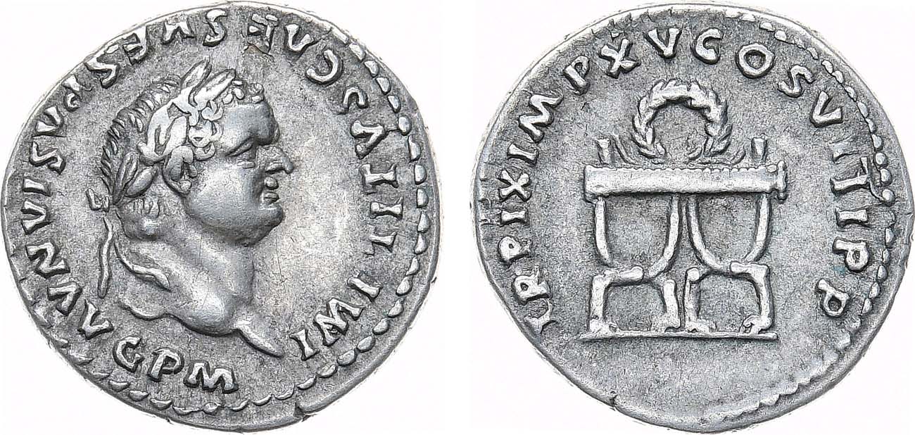 Серебро. 3,34г. Рим. Аверс: портрет императора - вправо; круговая легенда "IMP TITVS CAES VESPASIAN AVG P M". Реверс: изображение курульного кресла; круговая легенда "TR P IX IMP XV COS VIII P P". XF+.