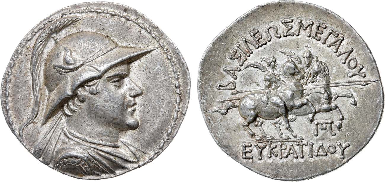 Серебро. 17,02г. Аверс: изображение царя вправо - в шлеме с гребнем. Реверс: круговая легенда "BAΣΙΛΕΩΣ ΜΕΓΑΛOY/ΕΥΚIΑΤIΔΟΥ"; изображение Диоскуров, держащих копья и пальмовые ветви, на конях; монограмма на поле справа. Bopearachchi 6U. HGC 12,131. AU.