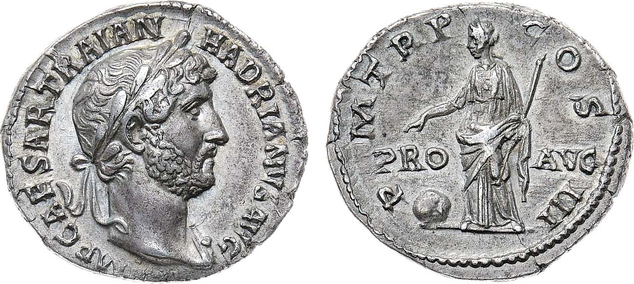 Серебро. 2,93г. Рим. Аверс: круговая легенда "IMP CAESAR TRAIAN HADRIANVS AVG"; портрет императора вправо. Реверс: круговая легенда "PRO AVG P M TR P COS III"; ростовое изображение Провиденции влево. Sear 3530. AU.