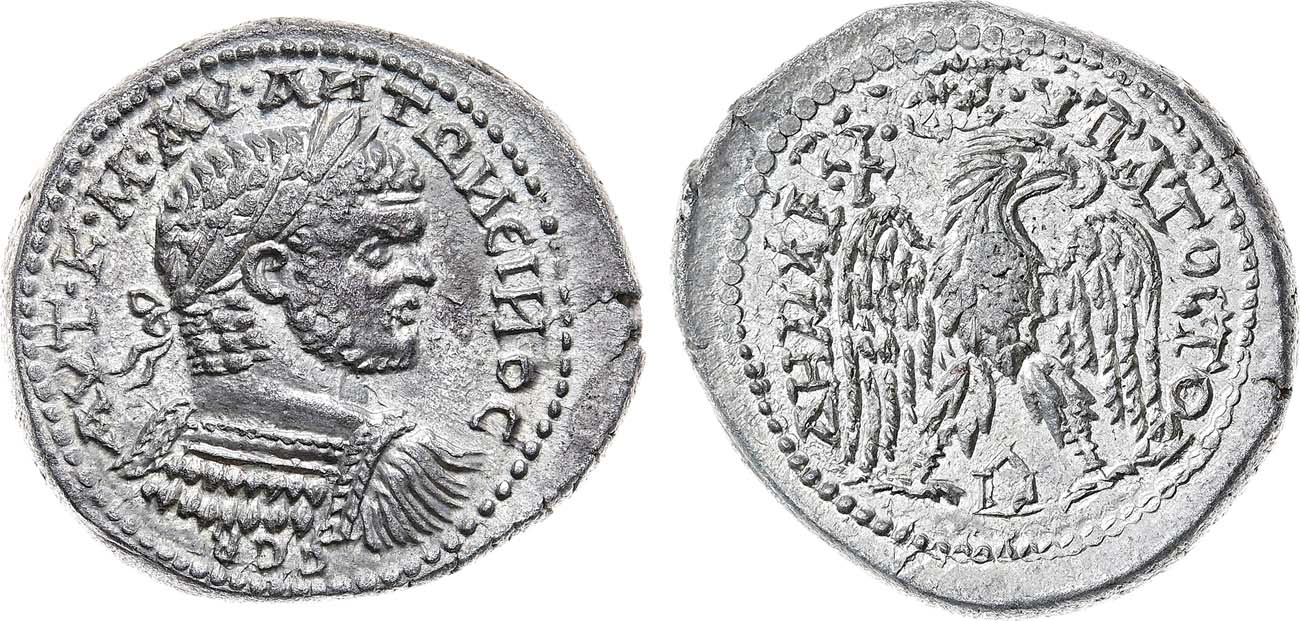 Серебро. 13,39г. Аверс: круговая легенда "AYT KAI ANTⲰNINOC CЄ"; портрет Каракаллы вправо. Реверс: круговая легенда "ΔΗΜΑΡ•Χ•ЄΞ•ΥΠΑΤΟC ΤОΔ"; изображение орла вправо. UNC.