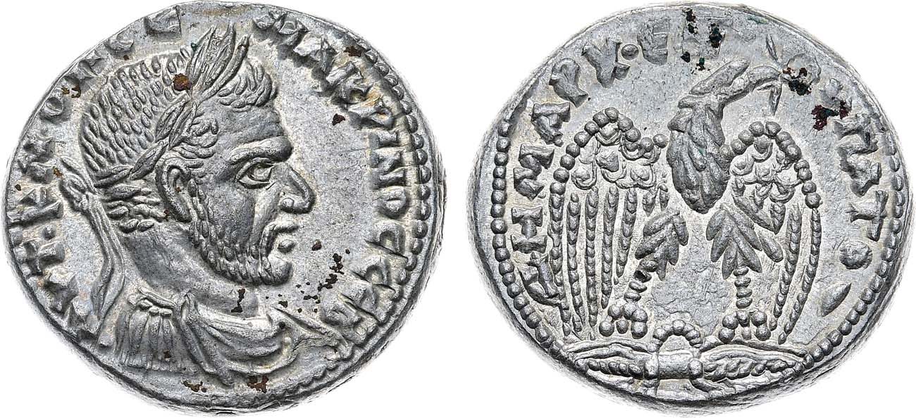 Серебро. 13,67г. Эмеса. Аверс: круговая легенда "AVT· K·M·OΠ· CE· MAKPINOC CEB"; портрет императора в лавровом венке - вправо. Реверс: круговая легенда "ΔHMAPX EΞ VΠATO"; изображение орла - вправо. Bellinger 39. Roman Antioch 721. Prieur 246. UNC.
