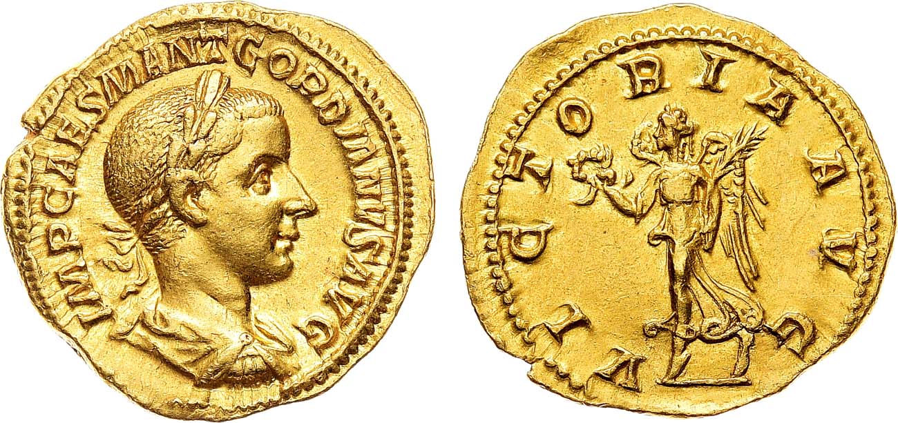 Золото. 4,78г. Рим. Аверс: портрет императора в лавровом венке вправо; круговая легенда "IMP CAES M ANT GORDIANVS AVG". Реверс: изображение богини Виктории с венком и пальмовой ветвью в руках - влево; круговая легенда "VICTORIA AVG". AU/UNC.
