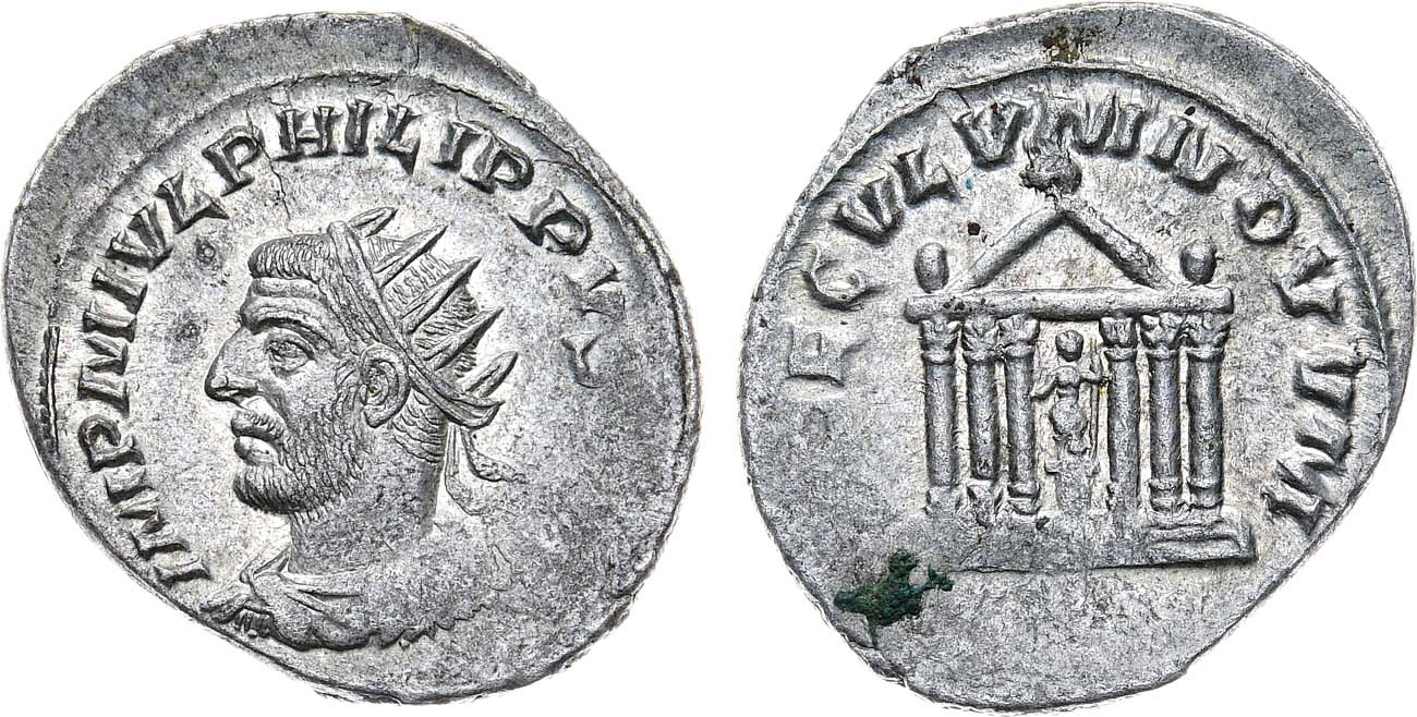 Серебро. 3,83г. Рим. Аверс: портрет императора влево. Реверс: круговая легенда "SAECVLVM NOVVM"; изображение храма и статуи Ромы. Sear 8963. AU.