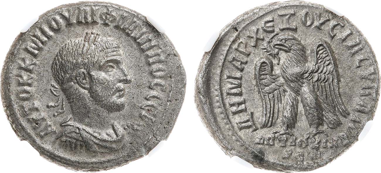Серебро. Антиохия. Аверс: портрет императора вправо; круговая легенда "AYTOK K M IOYΛI ΦIΛIΠΠOC CЄB". Реверс: изображение орла - влево; круговая легенда "ΔΗΜΑΡΧ ЄΞΟΥϹΙΑϹ ΥΠΑ ΤΟ Δ", внизу под изображением - "ΑΝΤΙΟΧΙΑ SC". Prieur 444. AU+.