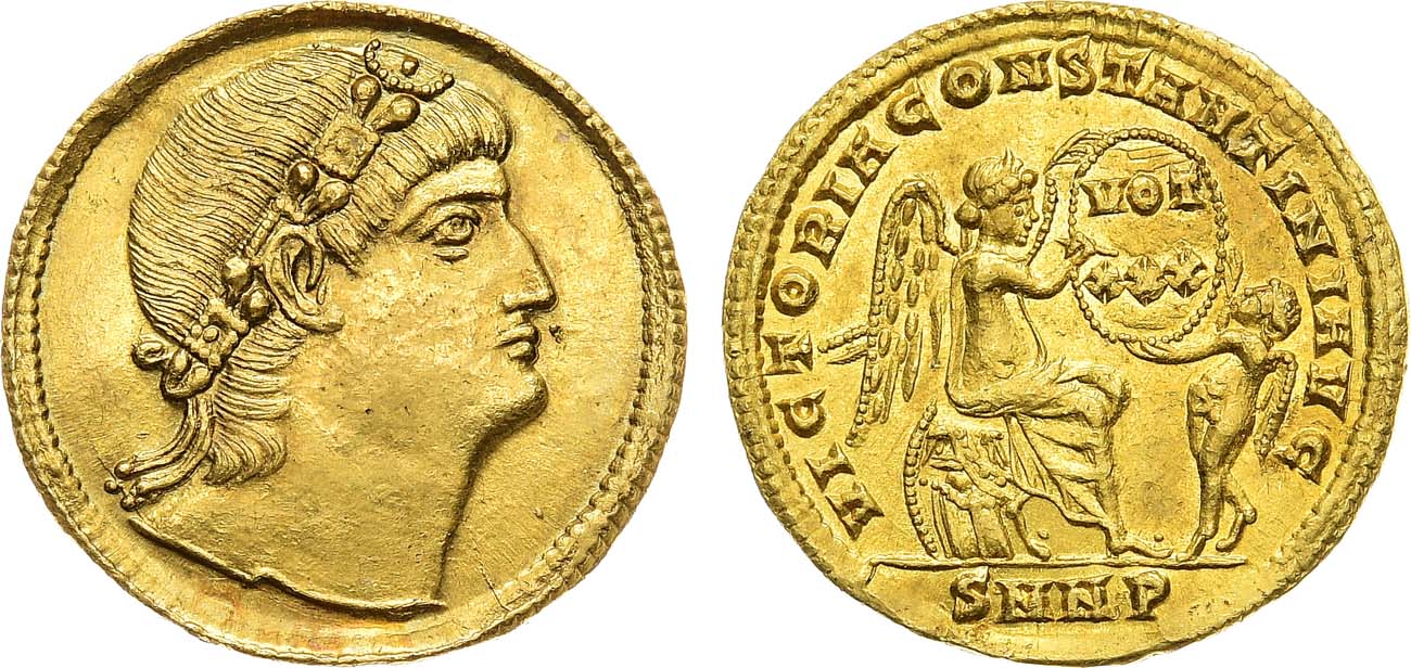 Золото. 4,43г. Никомидия. Аверс: портрет императора в диадеме вправо. Реверс: круговая легенда "VICTORIA CONSTANTINI AVG"; изображение богини Ники на троне с щитом (легенда внутри щита "VOT/XXX"); внизу "SMNP". Sear 15758. AU.