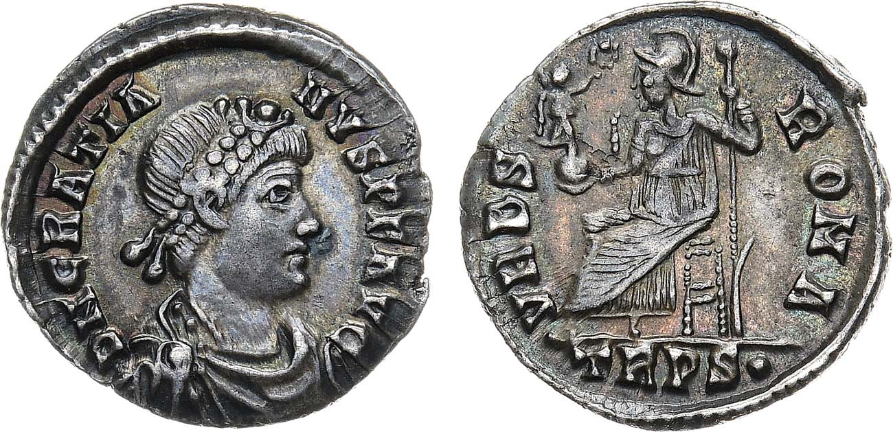 Серебро. 1,67г. Трир. Аверс: портрет императора вправо; круговая легенда "D N GRATIA - NVS P F AVG". Реверс: тронное изображение богини Ромы - влево; легенда "VRBS - ROMA"; внизу под обрезом "TRPS. AU.