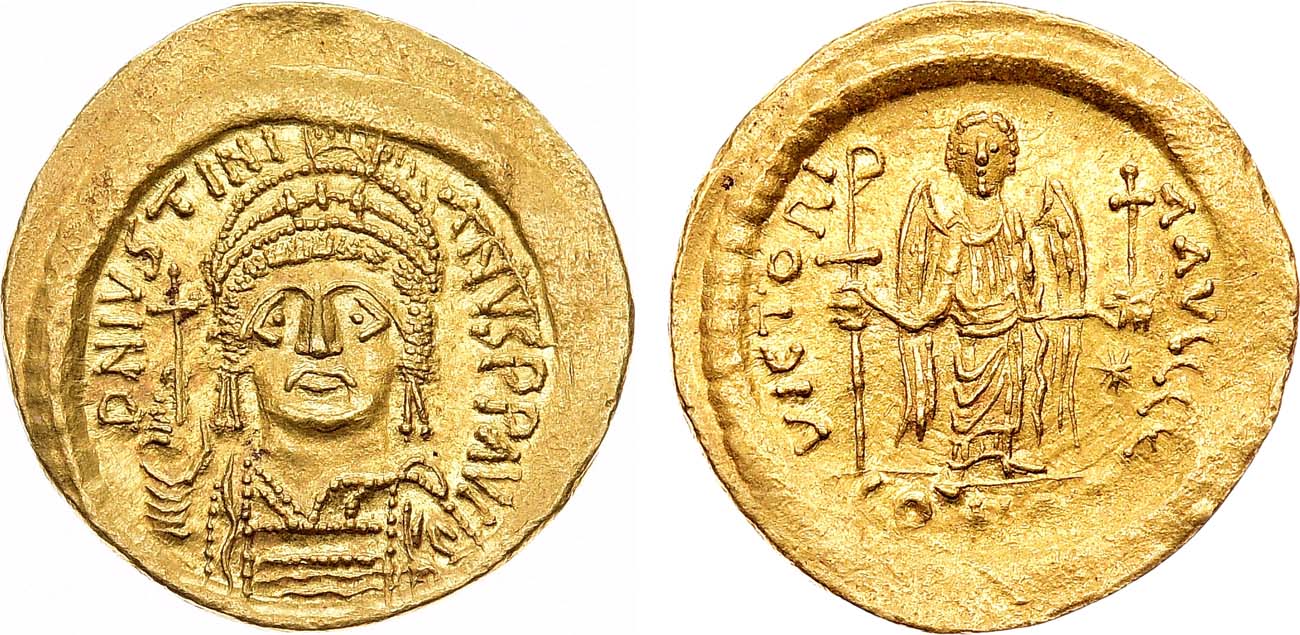Золото. 4,41г. Константинополь. Аверс: портрет императора анфас, с державой в правой руке; круговая легенда "DN IVSTINI-ANVS PP AVG". Реверс: круговая легенда "VICTORI-A AVCCC Е; изображение Ангела анфас с увенчанным хризмой посохом в правой руке и державой с крестом - в левой; под державой на поле - звезда, под обрезом "CONOB". Sear 140. Sommer 4.3.3. UNC.