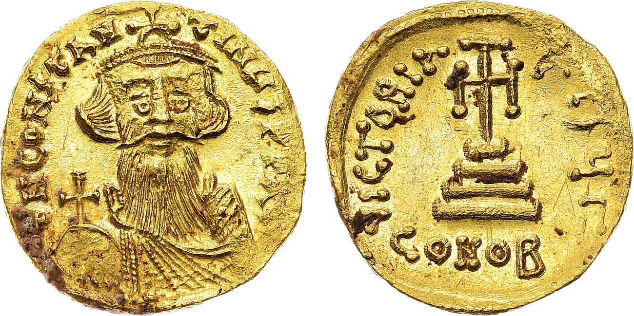 Золото. 4,5г. Константинополь. Аверс: круговая легенда "DN CONSTAN-TINЧS PP AV; изображение императора с длинной бородой анфас, в короне с крестом, с державой в правой руке. Реверс: круговая легенда "VICTORIA-AVГЧ I", изображение Креста на четырёх ступенях, внизу "CONOB". Sear 957. Sommer 12.16. MIB 25.. UNC.