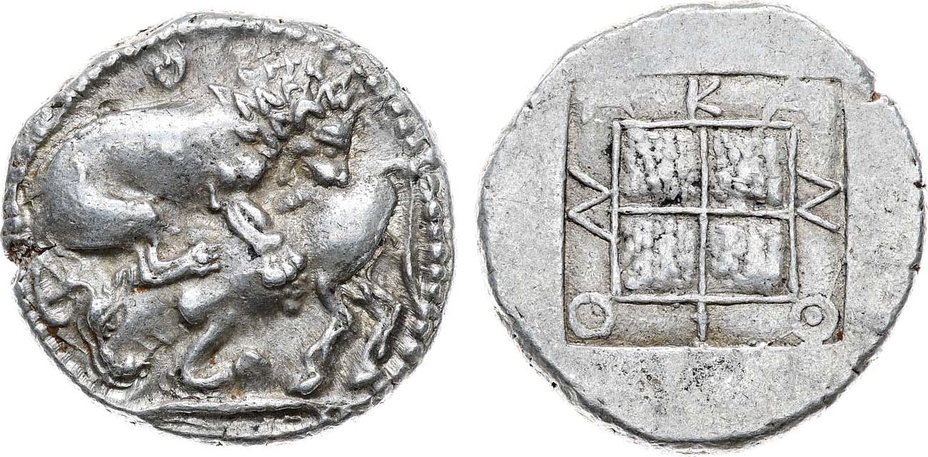 Серебро. 17,04г. Аверс: изображение сцены нападения льва на быка. AU.