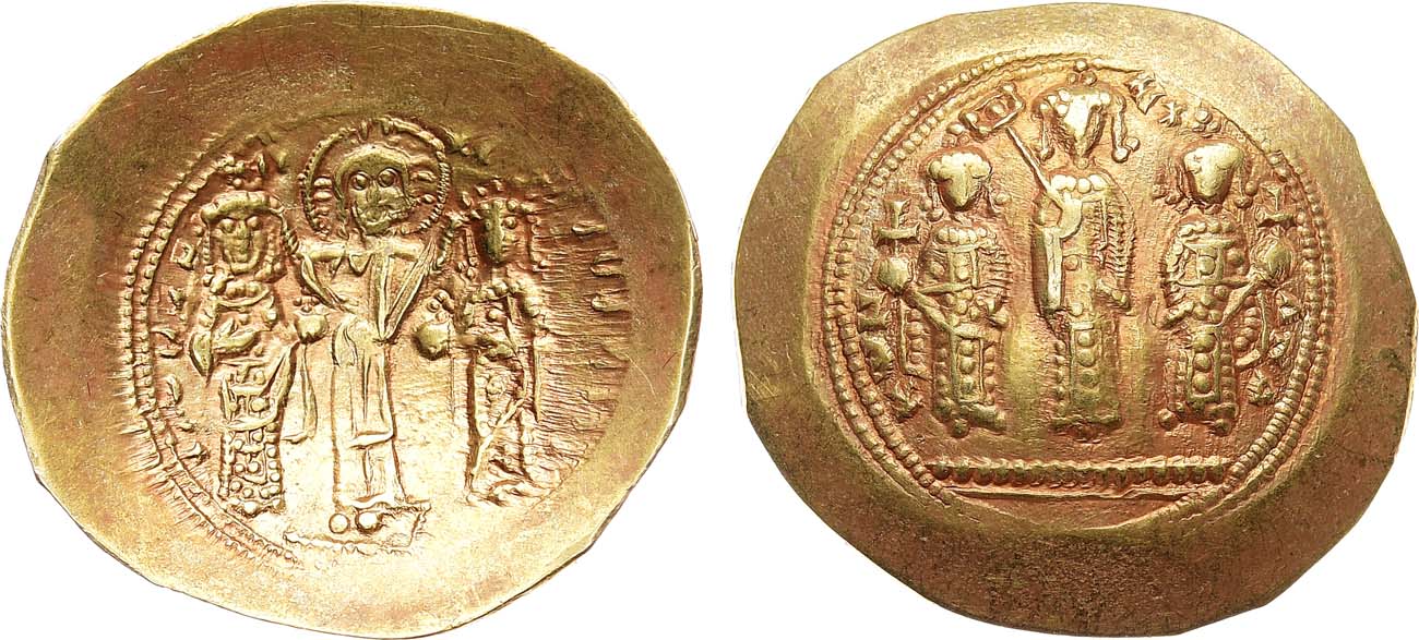 Золото. 4,37г. Константинополь. Аверс: круговая легенда "RѠMAN' - ЄVΔOKIA"; изображение Христа, возлагающего руки на Романа и Евдокию. Реверс: круговая легенда "+KѠN - MX - ANΔ"; изображение Михаила VII, Констанция и Андроника - по сторонам от него. Sear 1861. Sommer 54.2.1. AU.