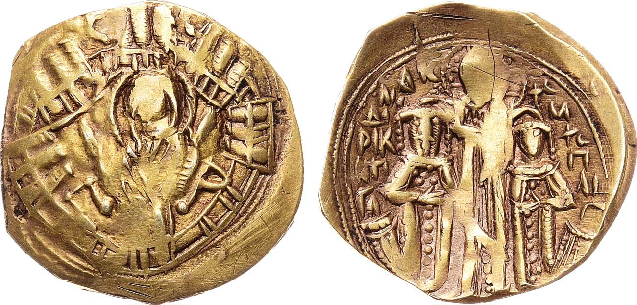 Золото. 3,85г. Константинополь. Аверс: изображение Богоматери среди городских стен. Реверс: изображение Христа в центре, возлагающего руки на императоров Андроника II и Михаила IX. Подобна Sommer 80.2.3. AU.