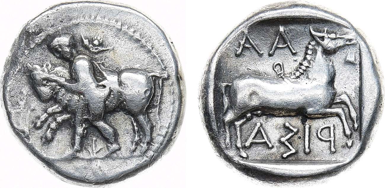 Серебро. 5,95г. Реверс: легенда "ΛA/AΣIP"; изображение лошади вправо. XF.