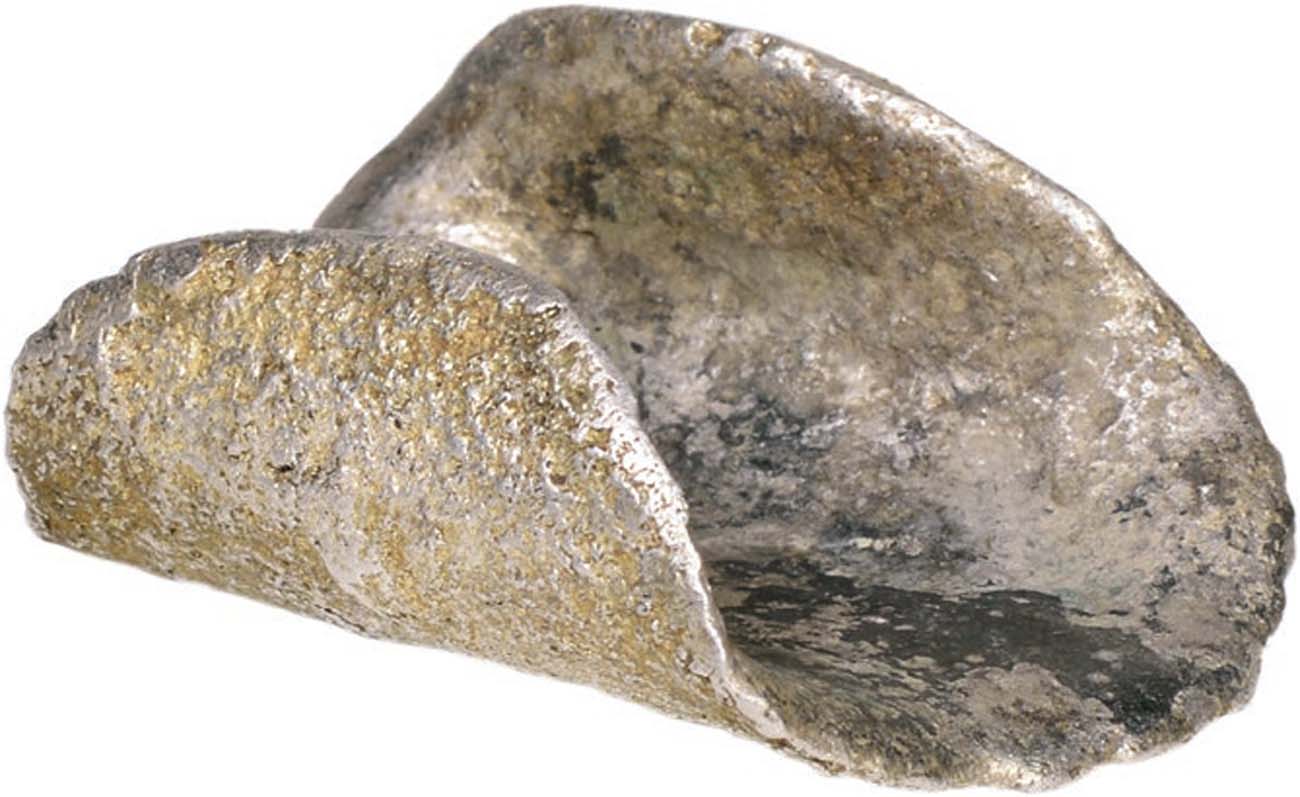 Серебро. 157,35г. Размер: 70х49,5х29 мм. Ширина (внешний диаметр): 46-49 мм. Ширина (внутренний диаметр): 35-49,5 мм. Толщина: 2-4 мм. На небольших сегментах краёв слитка видны следы проковки металла. Прокопов 11. AU.